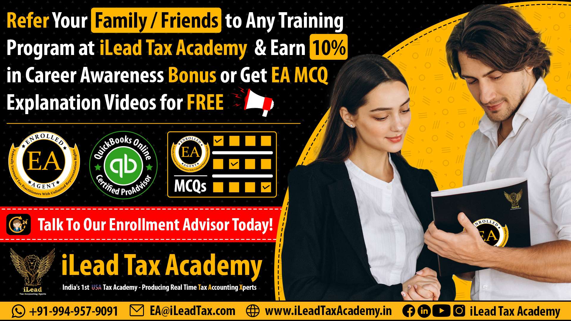 Refer Your Family / Friends to Any Training Program at iLead Tax Academy & Earn 10% in Career Awareness Bonus Or Get Complete EA MCQ Explanation Videos for FREE